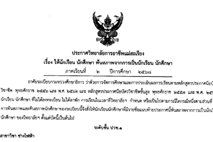 ประกาศวิทยาลัยการอาชีพแม่สะเรียง เรื่อง ให้นักเรียน นักศึกษา พ้นสภาพจากการเป็นนักเรียน นักศึกษา ภาคเรียนที่ 1 ปีการศึกษา 2568
