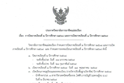 วิทยาลัยการอาชีพแม่สะเรียง ประกาศกำหนดการปิดภาคเรียนที่ 2 ปีการศึกษา 2568 และเปิดภาคเรียนที่ 1 ปีการศึกษา 2569